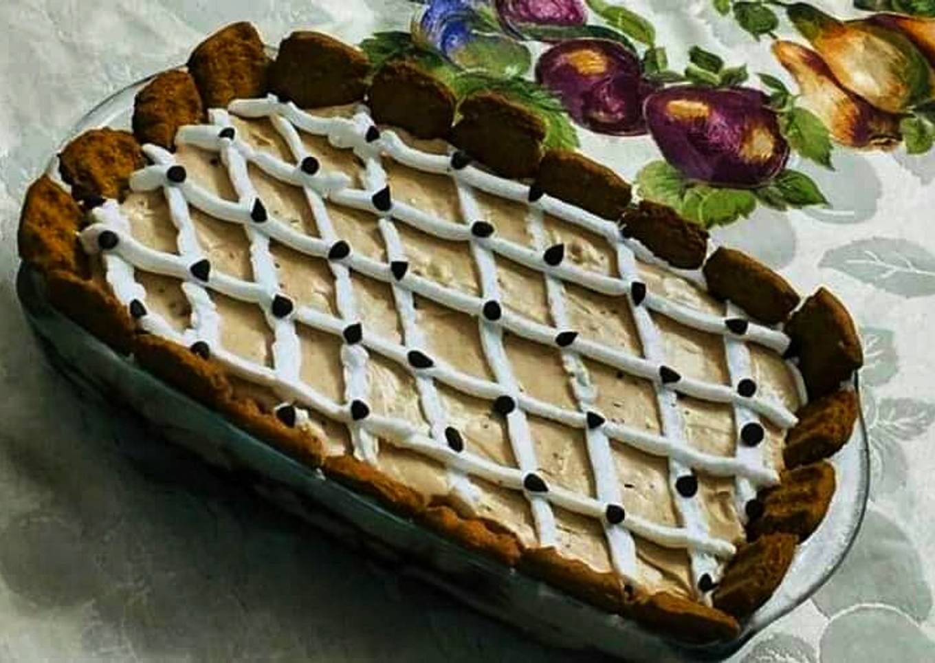 - Now TAKE a dish layer with biscuits pour sugar and coffee mixture then layer with whipped cream now sprinkle chocolate chips then again layer with biscuits again pour coffee mixture then layer with cream and decorate with chocolate chips,leftover biscuits and cream